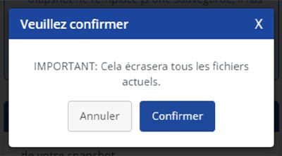 Restaurez un instantané en un seul clic en cliquant simplement sur le bouton Restaurer. Vous confirmerez alors l'écrasement de vos fichiers actuels.