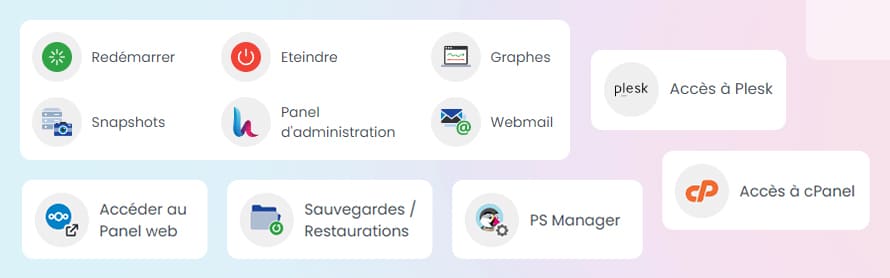 Mit dem LWS Control Panel können Sie alle Ihre Dienste verwalten. Sie können Ihren virtuellen dedizierten Server problemlos neu starten, herunterfahren und konfigurieren: Erstellen Sie einen sekundären DNS-Server, aktivieren Sie Reverse DNS, installieren Sie einen E-Commerce-Shop, öffnen und schließen Sie Ports, aktivieren oder deaktivieren Sie den SSH-Zugang und verwalten Sie die automatische Erneuerung Ihres Vertrags.